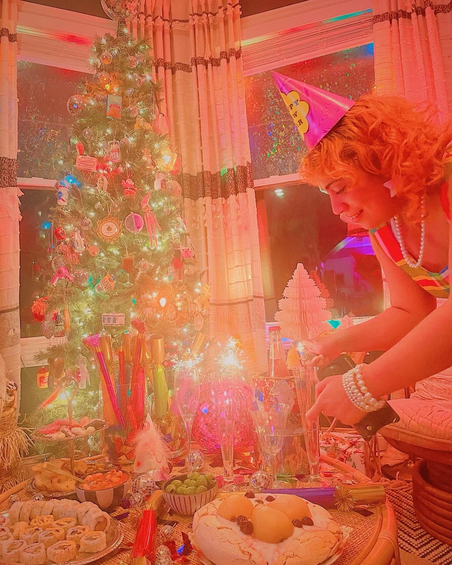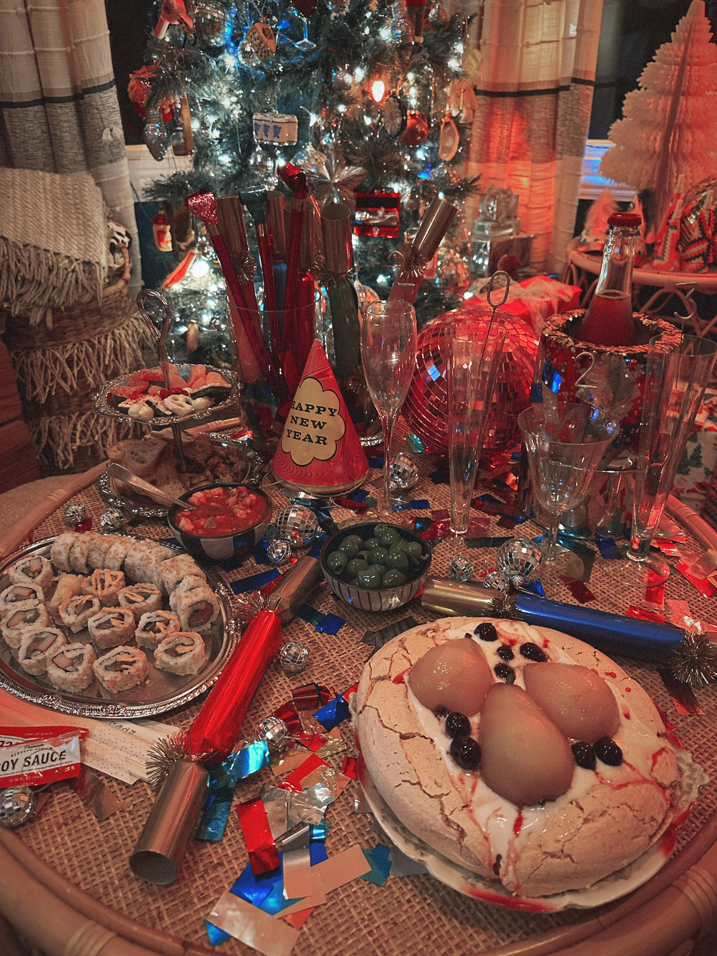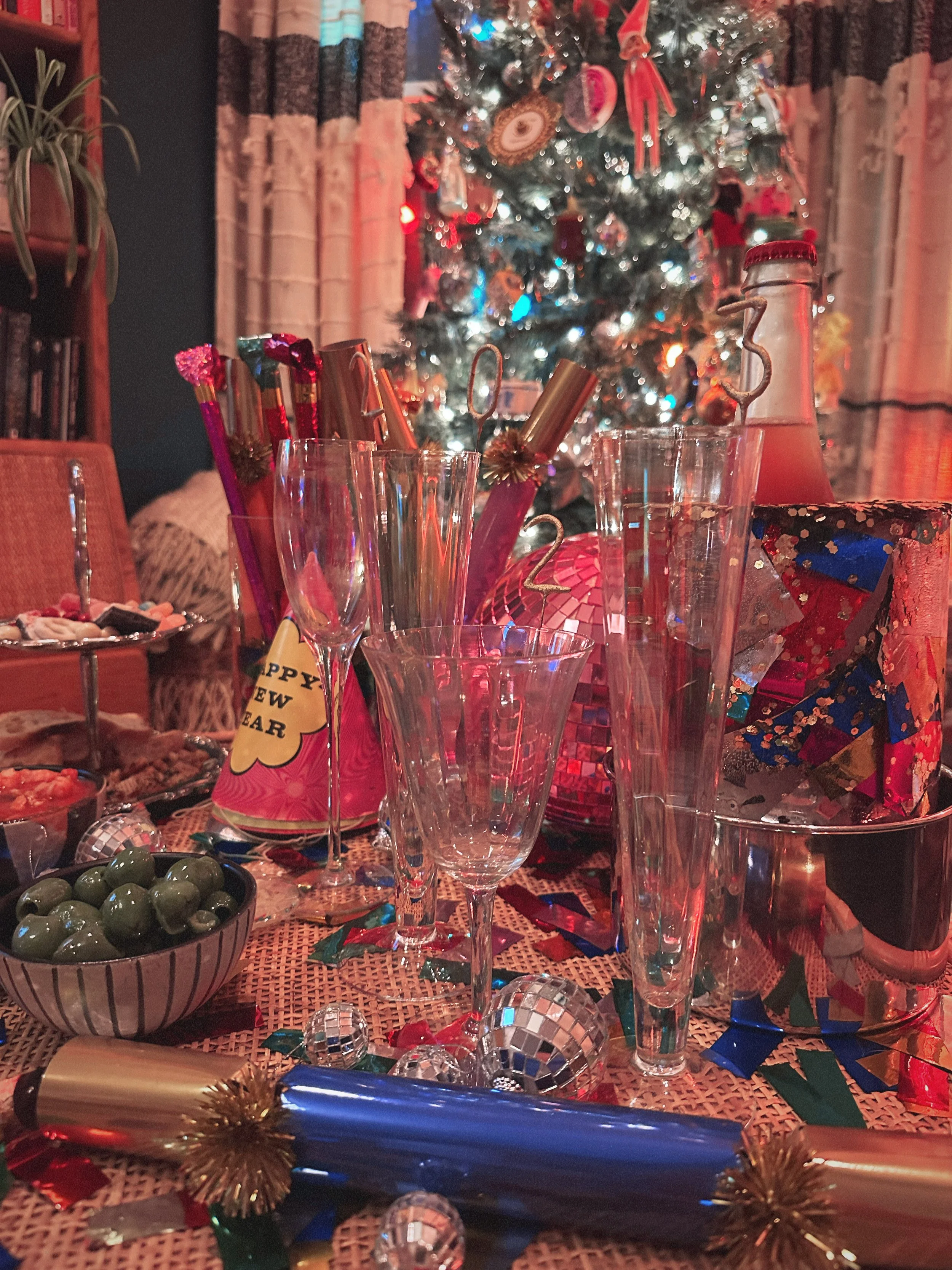 I found some vintage NYE decorations at the antique market that inspired me to do this theme. I also remembered my friend Louise had just purchased a vintage skirt from Kareena Vintage with a party cracker print. I obviously demanded she wear it to match the party crackers I had as table top decor! My favorite part of this table top is the ice bucket mold I made. I froze colorful glitter and confetti in it and it turned out so magical.